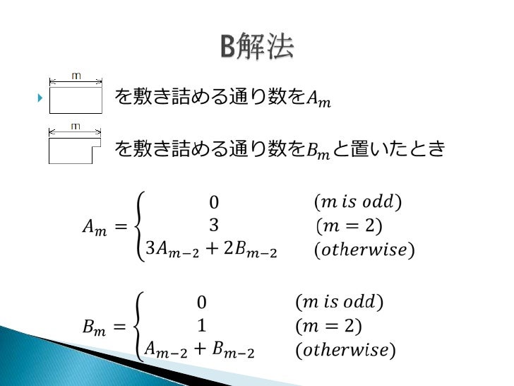 ベランダマット・タイル敷きの相場 ベランダマット敷きを料金や相場、口コミで比較し、オンライン予約することができます。 ベランダに人工芝を敷きたい、ウッドデッキを敷き詰めて印象を変えたい! そんな時はプロにベランダマット敷きを依頼し公益財団法人全日本スキー連盟 競技本部 お知らせ 競技本部各種派遣・選考基準の掲載について REPORT スキージャンプジャンプ女子サマーグランプリ 優勝・髙梨沙羅選手、2位・丸山希選手の好発進! REPORT 第1回クロスカントリー競技タレント 解いた赤diffでは2問目。(1問目はReversing and Concatenating) 2種類のタイルの敷き詰めなので、片方の敷き詰め方だけ考えて、もう片方を敷ける場所がたくさん確保できるように最適化する、という方針で行った。 とりあえず横向きを敷き詰め終わった後のことを考える。